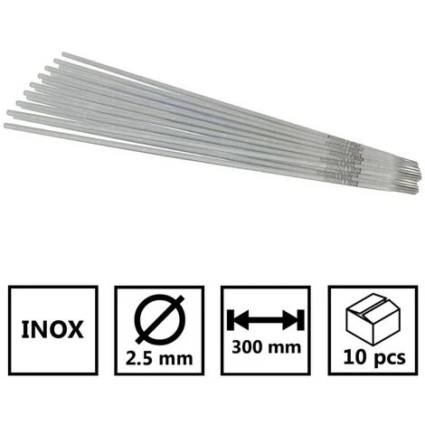 Ces électrodes inox enrobées ont été conçues pour la soudure à l’arc (technologie Inverter) sur l’acier inoxydable. D’un diamètre de 2.5mm et de longueur 300mm, elles peuvent être manipulées dans toutes les positions de soudures possibles. Ces baguettes possèdent de nombreux avantages : un faible taux d’impureté, une faible quantité de projection, une laitance facile à retirer, un amorçage de la soudure facile et une résistance à la corrosion et l’oxydation. Conçues pour la fabrication générale et architecturale, l’industrie alimentaire, pharmaceutique, et technologie nucléaire. Attention, lors du soudage ne pas respirer les fumées, travailler dans un lieu aéré et se protéger avec des EPI (Equipements de Protections Individuel). Emballage blister contenant 10 pièces.