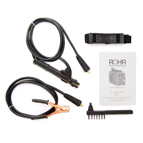 Lorsque vous achetez un poste à souder Röhr, vous recevez une panoplie complète d’accessoires qui répondront à tous vos besoins en soudure. Ce modèle est vendu avec une pince porte-électrode MMA (câble de 2 mètres), une pince de masse (câble de 1,5 m), une grande bandoulière et une brosse métallique. La machine à souder dispose également d’un câble électrique de 1,5 m qui vous permet de la placer à l’endroit de votre choix.