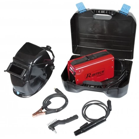 Chaque poste est livré dans une mallette avec 1 pince de masse et 1 pince porte-électrode (± 1,60 m chaque), 1 brosse avec marteau pour laitier, 1 masque de soudure à main, 1 bandoulière de transport. Puissance absorbée 4,1 KVA. Tension à vide 90 V. Courant de soudage 5-130 A. Facteur de marche 115 Amp à 55%. Classe de protection IP21 S.