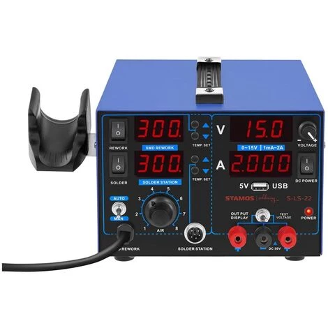 La station de soudage S-LS-22 de Stamos Soldering est un appareil 3-en-1 idéal pour braser et réparer divers composants et appareils électroniques comme des outils, circuits imprimés, étamages, pièces métalliques et bien plus encore. Ce kit multifonctionnel est composé d’un fer à souder, d’une buse à air chaud, d’un emplacement avec ports USB et représente le choix idéal pour effectuer des travaux de soudage et de brasage lesquels requièrent une grande fonctionnalité et qualité.