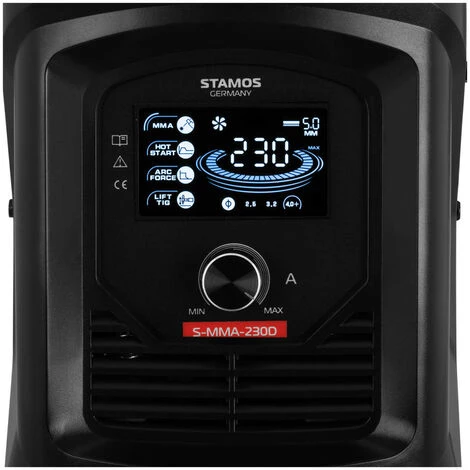 valeur peut être abaissée à 115 A. À l’amorçage, la fonction Hot Start accroit automatiquement le courant de soudage pendant un court moment pour empêcher l’électrode de coller, ce qui garantit des cordons propres et robustes dès le premier instant. Pour vos travaux extérieurs et en atelier, optez pour un poste à souder à l’électrode Stamos Germany !